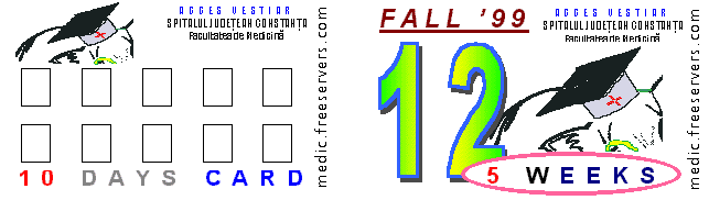 Permite accesul la vestiar în ziua cumpărării şi pentru următoarele 25 de zile când vestiarul este deschis, adică de 26 ori! (după data de 19 noiembrie 1999 nu se vor mai vinde cartele de 5 săptămâni!) Orice cartelă de 5 săptămâni cumpărată in perioada 12 noiembrie - 19 noiembrie expiră in ultima zi a perioadei, a dică la data de 17 decembrie 1999.It allows the access to the cloakroom for the day when you buy it, plus the following 25 days , so a total of 26 times you may use the cloakroom! After 19th of November it is not allowed to sell the 5 weeks cards. Any 5 weeks card bought between 12 - 19 November 1999 will expire on 17 December 1999 (last day of the period). |